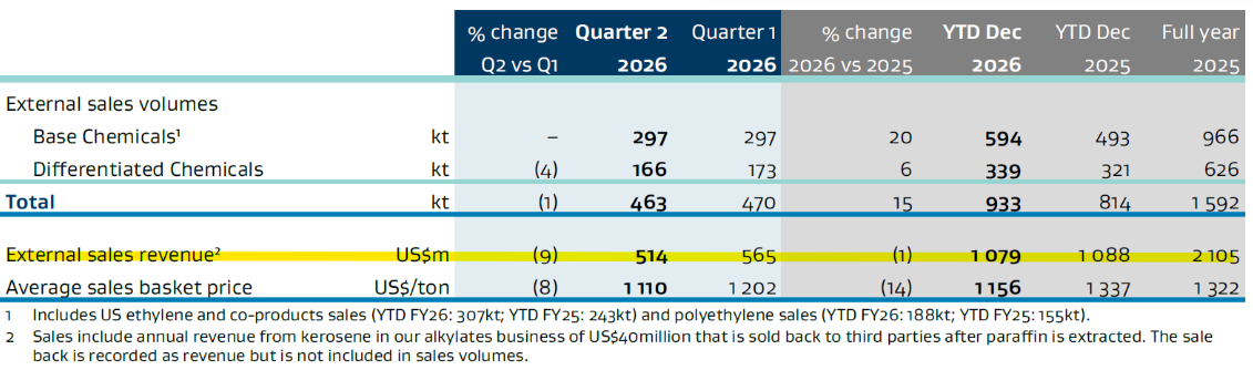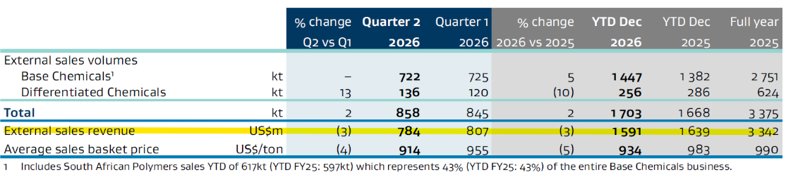 Chemicals Africa revenue fell 3% quarter-over-quarter on weaker pricing, with the average basket price dropping from $955 to $914 per ton.