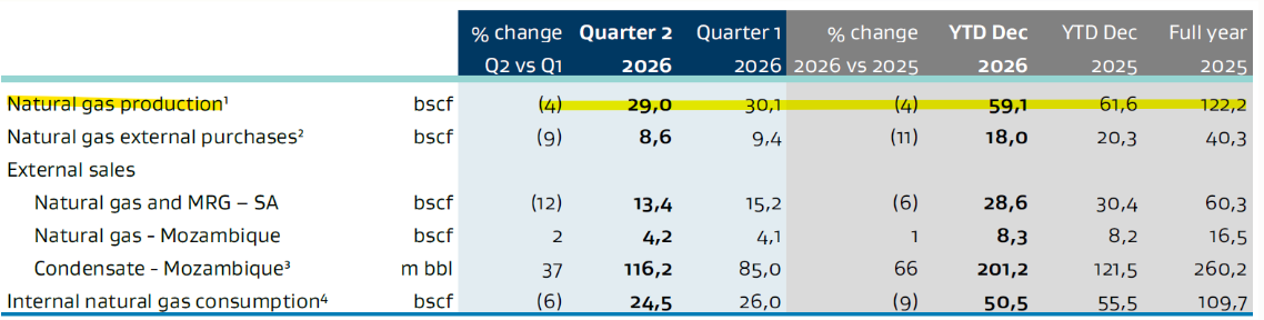 Mozambique gas production fell 4% quarter-over-quarter as the Petroleum Production Agreement (PPA) asset continues its natural decline.