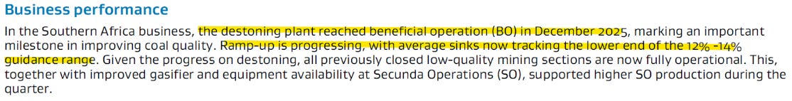 Sasol released their business performance metrics for the six months ended December 31, 2025, and the key data point is that the destoning plant reached beneficial operation in December.